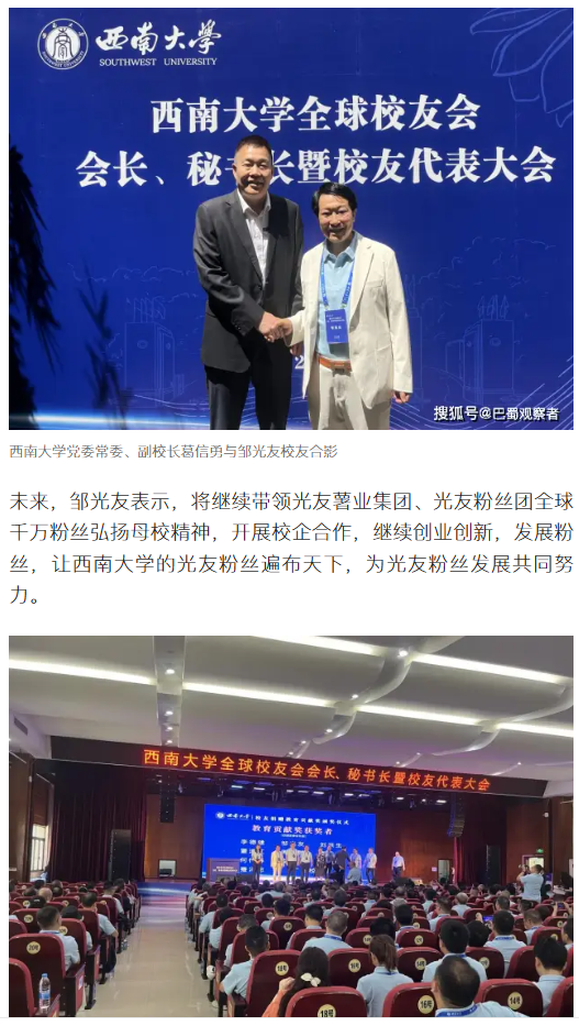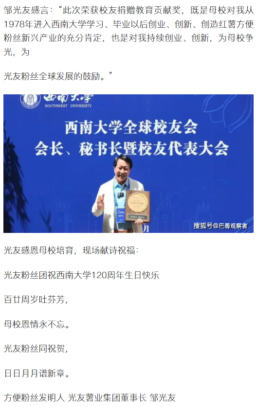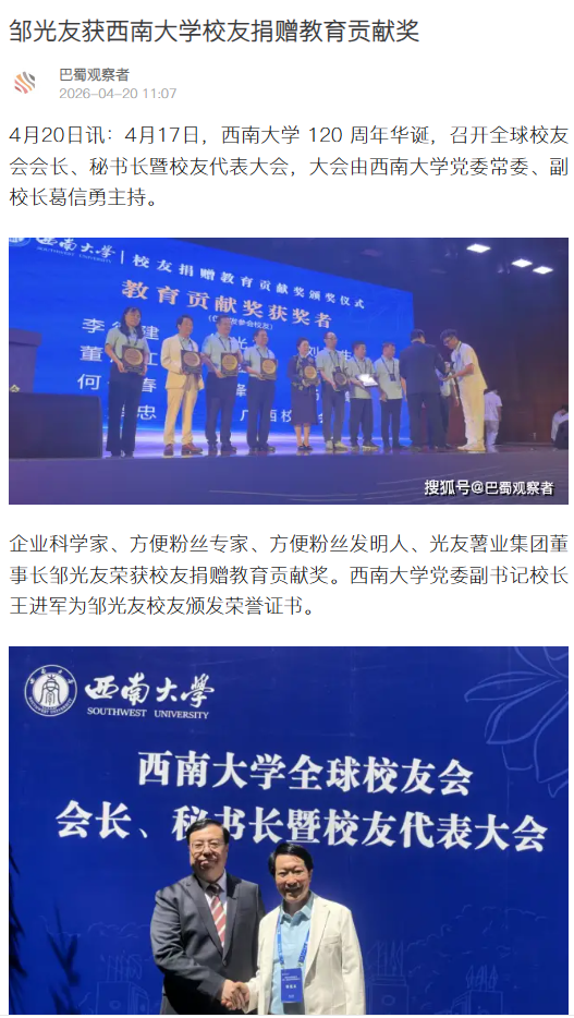 轉(zhuǎn)載搜狐網(wǎng) 鄒光友獲西南大學校友捐贈教育貢獻獎