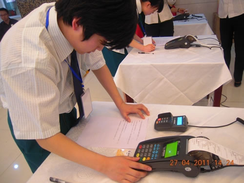參賽選手熟練、準確無(wú)誤的操作POS系統,做到刷卡流程準確、速度穩定