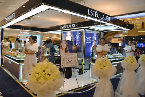 剪彩現場(chǎng),禮儀小姐為顧客展示雅詩(shī)蘭黛明星產(chǎn)品