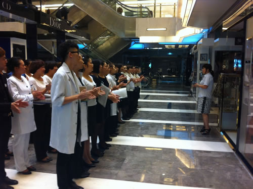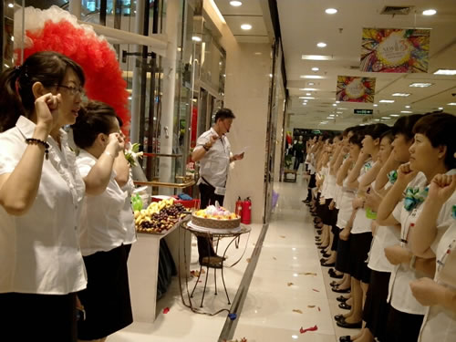 1、F1精品、化妝部主管向各位員工做店慶動(dòng)員。