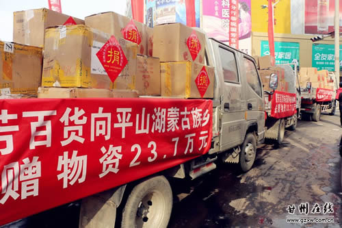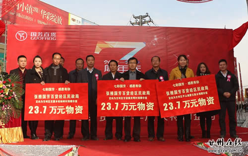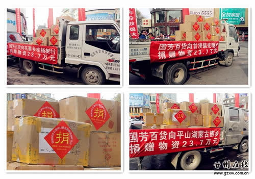 11月22日上午,張掖國芳百貨公司7周年慶典之際,為我區甘浚鎮光明村、花寨鄉柏楊樹(shù)村和平山湖鄉困難群眾一次性捐贈了價(jià)值71萬(wàn)元的物資。區委常委、常務(wù)副區長(cháng)秦偉、副區長(cháng)張興鋒出席了捐贈儀式。