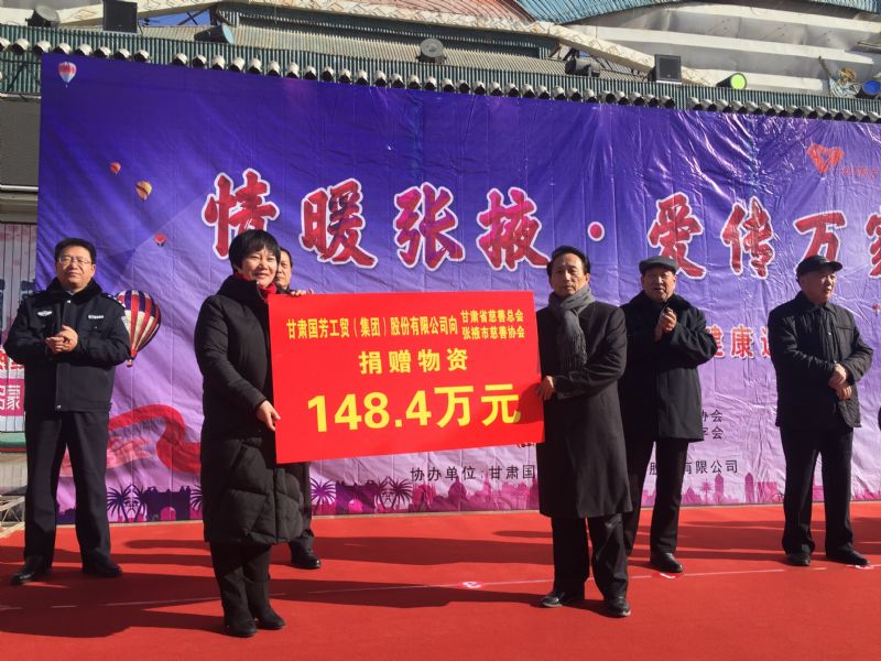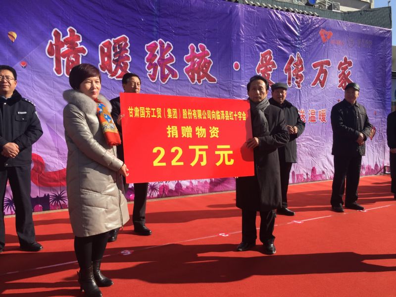 2019年1月11日,甘肅省慈善總會(huì )、張掖市慈善協(xié)會(huì )、甘州區慈善協(xié)會(huì )以及臨澤縣紅十字會(huì )攜甘肅國芳工貿(集團)股份有限公司在張掖市中心廣場(chǎng)共同舉行“情暖張掖·愛(ài)傳萬(wàn)家”送健康送溫暖活動(dòng),將2000套棉衣,2000余套秋衣秋褲,27臺彩電以及300余件小家電合計價(jià)值148萬(wàn)元的過(guò)冬物資帶給山丹縣,民樂(lè )縣的困難群眾,將2500個(gè)醫藥箱帶給臨澤縣的老人們。此次活動(dòng)傳導社會(huì )幫扶、精準扶貧精神的同時(shí)也默默為社會(huì )傳導著(zhù)一份正能量。